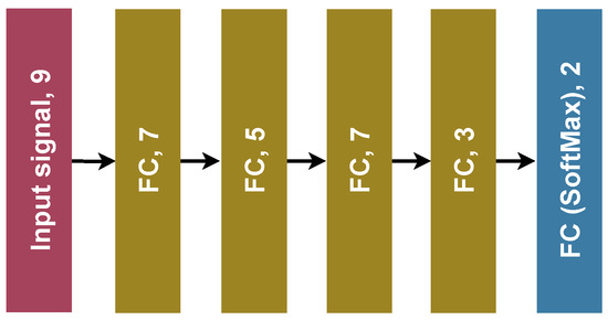 The MLP architecture consisted of four hidden layers, as shown in Figure 5. The total number of parameters was 214. This configuration was obtained through hyperparameter optimization using Bayesian optimization [41]. The network was defined using QKeras [42], which supports the definition and training of quantized layers and avoids post-training quantization. Each dense layer employed ReLu as an activation function, and softmax was applied to the output layer. The optimizer was set to Adam with a learning rate of 0.001. The number of epochs and the batch size were both fixed at 32.