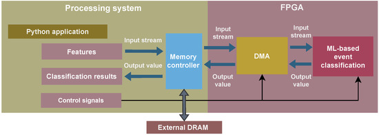 The extracted features were sent to the FPGA as an input stream through the memory controller. The FPGA part performed the classification, returning the result to the processing system, which was saved in .csv files stored on a memory card. A simplified set of functions were provided within the PYNQ framework to perform the data transfer between the FPGA and the processing system.