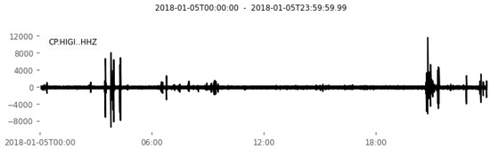 Example of a signal acquired by the HIGI station, Z channel. Day: 5 January 2018.