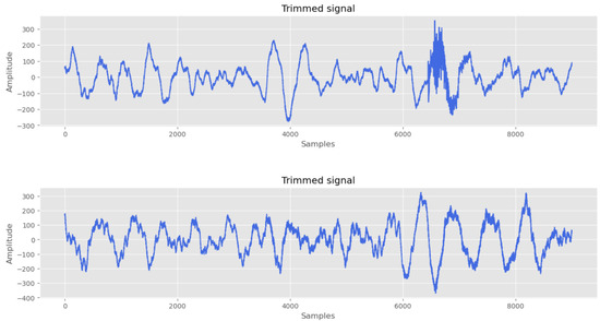 After the trim process, a total of 960 signals of 1 min 30 s duration were obtained for each raw signal. As the sample rate was 100 Hz, each trimmed signal was composed of 9000 samples, as shown in Figure 8.