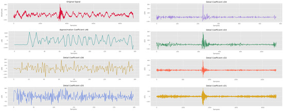 - Scale domain: The signal was filtered within the frequency range of 0.5–17 Hz and underwent the wavelet transform (WT), resulting in the extraction of approximation and detail coefficients.