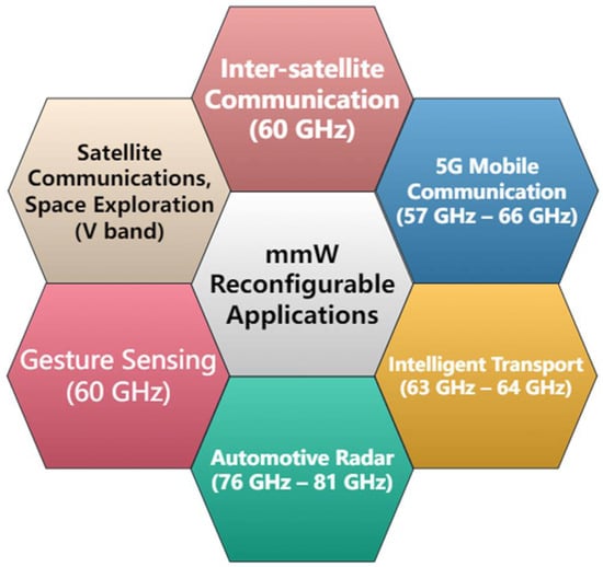 In recent decades, a surge of interest has been registered in the electronically reconfigurable microwave (MW) [1] and millimeter-wave (mmW) [2] components with low power consumption [3] and nonmechanical movements [4]. This is due to the growing demand for flexible and adaptable MW and mmW systems for use in both communications [5,6,7,8] and noncommunication applications [9,10], as illustrated by Figure 1 below.