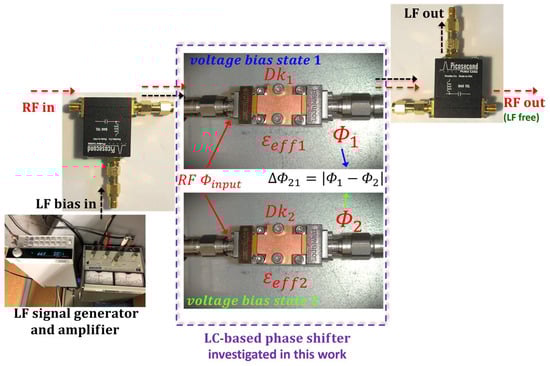 Looking analytically into the standalone LC-based phase shifter itself (as bounded by the dashed box in purple from Figure 2 above), the obtained differential phase shift is mathematically governed by Equation (1), where c is the speed of light, f is frequency, L is the length of the delay line, and and are the two states of the effective dielectric constant induced by diverse bias voltages, respectively.