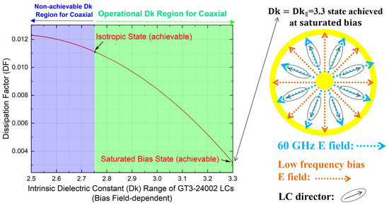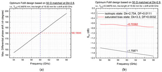 where is calculated by differentiating the two achievable extreme states of the effective permittivity at a specific frequency (e.g., 60 GHz), and the computation is performed by identifying the highest insertion loss among all tuning (biasing) states at the same frequency. From our past research and experimental results into the multidielectric type of LC-filled phase shifter [11,24], the primarily happens at the lowest operational Dk state, where the dissipation factor (DF) of the LCs is at its maximum (as characterized in Figure 3 in Section 2.1).