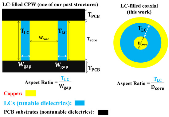 Geometry aspect ratios (AR) identified for our LC-filled CPW phase shifter [37] and LC-filled coaxial delay line model (this work).