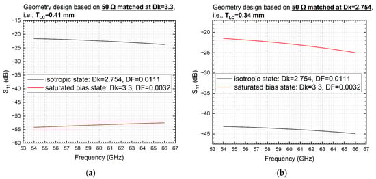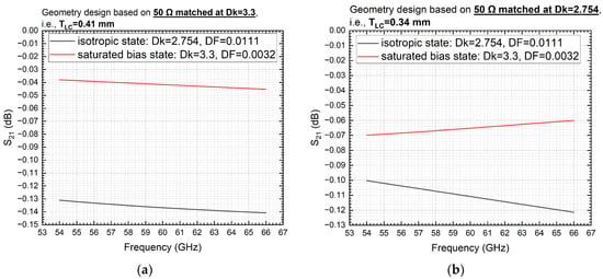 By way of illustration, we show our simulated insertion losses of a 1 mm long coaxially structured LC delay line from 54 GHz to 66 GHz for the two extreme bias states plotted in the same graph, i.e., isotropic state ( = 2.754, = 0.0111) and saturated bias state ( = 3.3, = 0.0032). Two designs are shown and compared, i.e., Figure 5a on a geometry with 50 Ω impedance matched at the saturated biased Dk = 3.3 state (corresponding to = 0.41 mm) versus Figure 5b on another geometry that is 50 Ω impedance matched at the isotropic Dk = 2.754 state (corresponding to = 0.34 mm). Both designs are 1 mm in length, differing in the due to the different Dk matching baselines chosen.