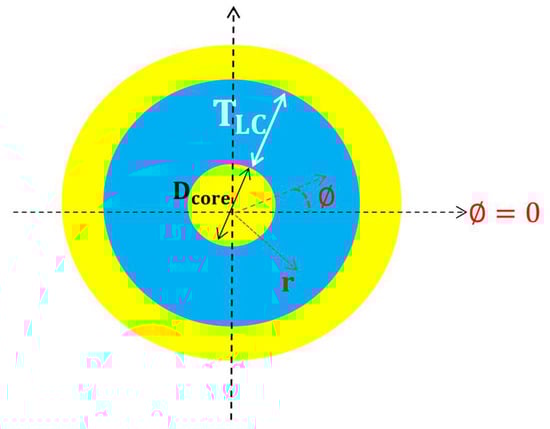 Cylindrical coordinate employed for the cross-section of our LC-filled coaxial delay line model. Conductors are denoted in yellow, and the filled LC region is depicted in blue.