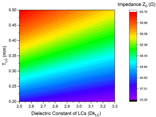 The molecular shape anisotropy of LCs not only induces variable dipole moments for the electric permittivity variation but also causes the characteristic impedance of the device to be variable (bias-dependent). As such, it is essential to gain a comprehensive grasp of the impedance calculations. The obtained characteristic impedance () at 60 GHz is plotted in a contour map parameterized with LCs’ dielectric thickness () and LCs’ dielectric constant () in Figure 8 below, with the core line’s diameter fixed at 0.23 mm (for interfacing typical V band connectors at both terminals).