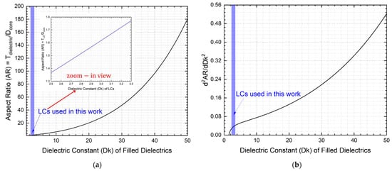 If we view the results of Figure 8 from the lens of aspect ratios (AR) of to , we obtain a quasilinear relationship between AR and (between 2.5 and 3.3 in this work), as observed in the zoom-in view of Figure 9a below. Instead of the requirement on increasing with , Figure 9a indicates that it is the AR that matters instead of the pure dependence on . This finding inspires a new way to drastically improve the coaxial-type LC device’s tuning speed, i.e., by reducing without increasing , AR will rise and satisfy the impedance matching constraint. To test the validity of this for a wider range of Dks (not necessarily LCs), Figure 9a presents the extended view of AR vs. Dk for Dks up to 50. Interestingly, the relationship between AR and Dk becomes nonlinear, and the nonlinearity becomes more significant with the increases in Dk (upwardly concave), as evidenced by Figure 9b, produced by taking a second-order derivative of the curve from Figure 9a. This indicates that the further increase in Dk (material selection problem) is detrimental to the device’s fabrication feasibility, as the drastically increased AR results in a slump in , which challenges the microfabrication of existing coaxial core lines. Assuming the is fixed at the minimally achievable value, the drastically increased AR will require a surge in , resulting in a surge in power consumption and response time (for obtaining the maximally achievable phase shift).