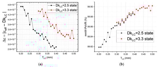 60 GHz simulation results for: (a) deviation between computed effective permittivity of the coaxial delay line device and LCs’ intrinsic dielectric constant (macroscopically) at various LC thicknesses; (b) derived mmW-PoVR in tunable dielectrics (LCs) of various thicknesses for the coaxial delay line.