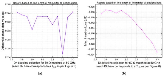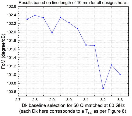 Phase shifting and insertion loss performance optimization and hence the FoM enhancement at 60 GHz based on the proposed Dk baseline impedance matching approach is investigated, with the parameterization results reported in Figure 11a for the differential phase shift, Figure 11b for the maximum insertion loss, and Figure 12 for the derived FoM. Note that each of the Dks in the horizontal axis corresponds to a specific for 50 Ω, the data of which have been mapped in the contour results shown earlier in Figure 8.