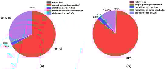 Simulated 60 GHz power transmission and dissipation decomposition for the optimized LC-filled coaxially structured 0–180° variable phase shifter design ( = 0.34876 mm, line length = 15.92 mm): (a) Dk = 2.754 state (LCs at isotropic status); (b) Dk = 3.3 state (LCs at saturated bias status).