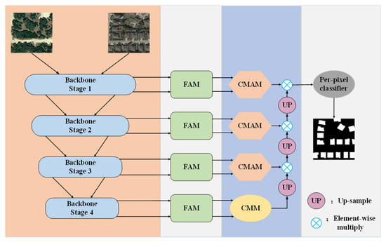 Figure 1 illustrates the overall architecture of the cross-mixing attention network. This network takes three channels of dual-temporal remote sensing images as input and generates a single channel for change prediction maps. Dual-temporal images are processed through a dual-branch weight-sharing encoder, utilizing EfficientNetB4 [41] for feature extraction in each branch. Extracted dual-temporal feature maps from each layer are fed into the feature alignment module (FAM), where pixel resampling corrects the feature maps, alleviating the misdetections caused by alignment errors. These corrected feature map channels are merged through the cross-mixing attention module (CMAM), employing MLP to optimize global channel-related information in the feature map and resulting in attention map generation. During decoding, the attention map guides the up-sampling process, compensating for spatial detail loss in deep features and enhancing the information within different feature maps. Finally, the difference feature map, restored to its original size, is processed by the per-pixel classifier to derive the ultimate change prediction map.
