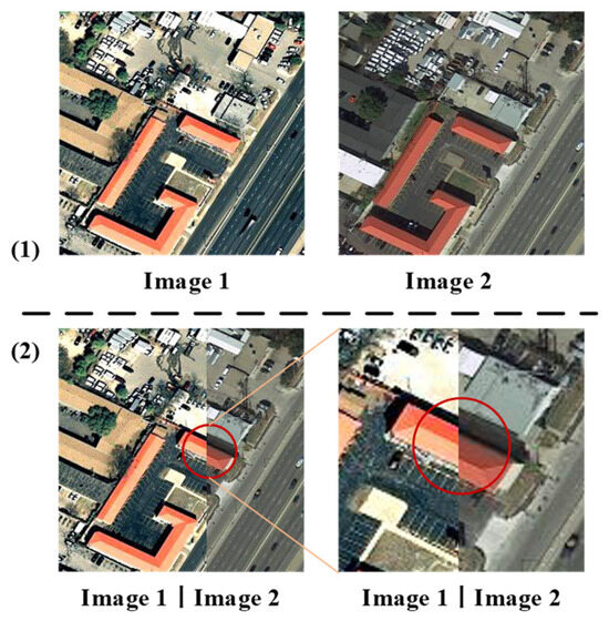 (1) Dual-temporal remote sensing images; (2) misregistration errors diagram. (Red circles indicate zooming in on details for a clearer view).