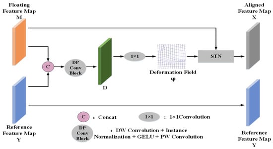 To maintain the spatial resolution, a 1 × 1 convolutional layer compresses D, producing the deformation field φ. Each pixel in φ signifies the correspondence between the pixel value coordinates in the floating feature map M and the reference feature map Y, essentially indicating the displacement vectors between the corresponding pixels of both maps. Subsequently, the spatial transformation network takes the deformation field φ and floating feature map M as inputs, correcting M using φ to yield the aligned feature map X, as depicted in Expression (2):