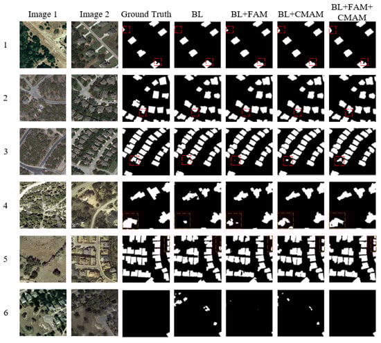 Partial predictions of ablation experiments on LEVIR-CD dataset. The red boxes are drawn to highlight the advantages of our modules. The numbers 1–6 represent 6 sets of experimental results.