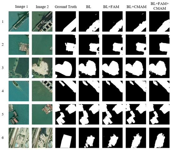 Table 3 demonstrates how incorporating the CMAM module into BL results in increases of 1.14% in Pr, 5.35% in Rc, 2.16% in F1, 2.95% in IoU, and 0.64% in OA compared to BL. In comparison with BL + FAM, it registers increases of 1.66% in Rc, 0.50% in F1, 0.69% in IoU, and 0.15% in OA, with a decrease of 2.04% in Pr. Consequently, although BL + CMAM outperforms BL + FAM overall, there is an increase in false positives. The predicted outcomes in columns 5 and 6 of Figure 6 highlight BL + CMAM’s strengths in global target area recognition. However, registration errors result in the incorrect identification of boundary position information within the target area.
