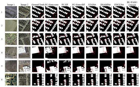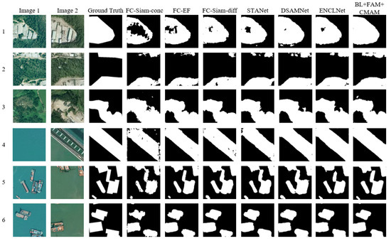 To assess the model’s validity, BL + FAM + CMAM was compared with six networks using the SYSU-CD dataset. A subset of prediction results and quantitative metrics from the SYSU-CD dataset is depicted in Figure 8 and Table 5.