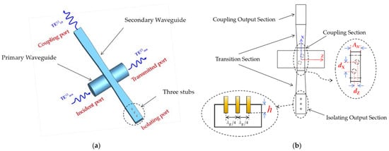 In order to overcome the problems existing in the traditional structure (the contradiction between wide bandwidth and miniaturization), an improved double-hole high-order mode circular waveguide directional coupler is proposed in this work, adopting an orthogonal connection between the main and secondary waveguides, with three metal stubs loaded on the isolating port of the coupler, as shown in Figure 1.
