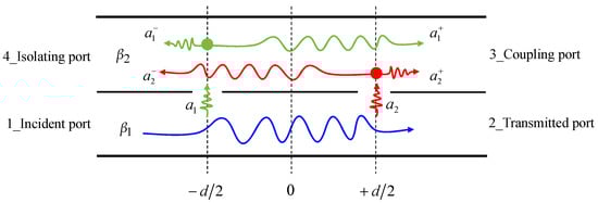 Directional couplers are well-known passive four-port devices with a directional transmission function [16]. Figure 2 shows the schematic diagram of a common symmetrical double-hole directional coupler. To minimize the influence of the coupling holes on the transmission wave of the primary waveguide, the coupling between primary waveguide and secondary waveguide must be weak. Therefore, the amplitude of the wave transmitted from the input port to the pass-through port is generally regarded as constant [17]. Further, to simplify the study, the wall thickness of the waveguide is ignored. In the hypothesis that the shape and size of the two coupling holes are the same, their coupling degree is the same as well, denoted as . At the same time, it is assumed that the phase constant of the incident wave in the primary waveguide is β1, the phase constant of the excited wave in the secondary waveguide is β2, and the two holes are located at ±d/2 away from the symmetry center.