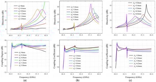 The coupling degree and directivity under (a) AN = 5 mm, dx = 4.2 mm with different dx; (b) AN = 5 mm, dz = 1.6 mm with different dx; (c) dz = 1.6 mm, dx = 4.2 mm with different AN.