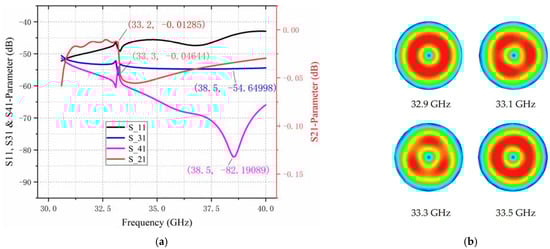 (a) Simulated S-Parameter at AN = 5.4 mm, dx = 4.2 mm, dz = 1.6 mm; and (b) E-Field distribution at 32.9 GHz, 33.1 GHz, 33.3 GHz, 33.5 GHz.