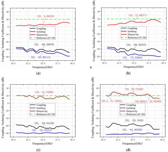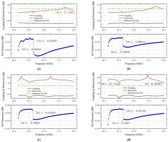 Figure 5 shows that when the insertion depths of the metal stubs were h = 0 mm, the total directivity of the coupler was low, the effective bandwidth was only 4.86%, and the directivity at the center frequency of 35 GHz was less than 5 dB. When the insertion depth was 1 mm, the directivity and effective bandwidth of the coupler had a small increase. As the insertion depth increased to 3 mm, the overall directivity and effective bandwidth of the coupler greatly improved, with an effective frequency band of 9.3 GHz (from 30.7 GHz to 40 GHz), an effective bandwidth of 26.29% and a directivity of more than 40 dB at the center frequency of 35 GHz. Compared to couplers without loading stubs, the effective bandwidth increased about five times. In addition, it can be noted that the loading of stubs has little effect on the transmission efficiency (S21-Parameter) of the coupler, which reaches almost 100% over the entire frequency band.