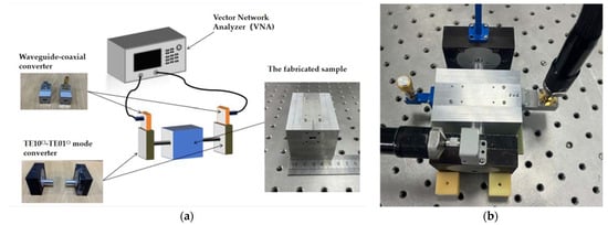 Based on the optimized parameters determined from the simulation results, a prototype coupler was fabricated, assembled, and tested. Figure 7 shows the test system and fabricated prototype sample. The total axial length of the manufactured sample was approximately 55 mm (about six times the operating wavelength), including a coupling section with a length of 33 mm and an input and output section, both with lengths of 11 mm.