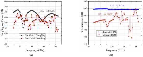 Figure 9 shows the comparison between the simulated results and the measured results of the coupling curve and transmission coefficient (S21-Parameter) when h = 3 mm. From Figure 9, it can be seen that the measured insertion loss of the coupler at the center frequency is about −0.26 dB (the corresponding transmission efficiency is about 94.16%), indicating that the transmission efficiency of the coupler was high and the TE01○ mode maintains high purity during transmission. It is worth noting that in the actual measurement, the fluctuation of the coupling curve was larger, and the maximum value was about 16.6 dB, which is larger than the simulation results and may be caused by machining and assembling errors.