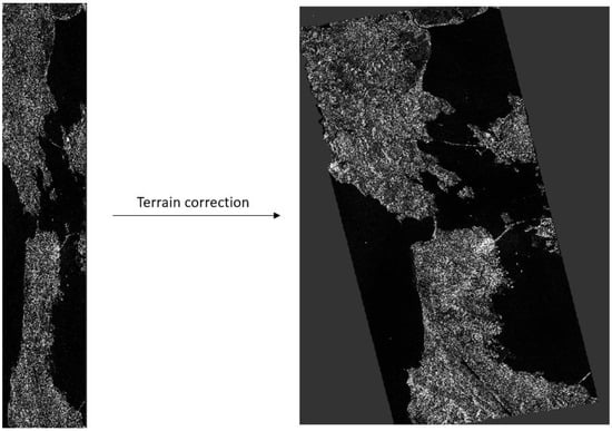 The image, initially in the acquisition geometry of the sensor, introduced distortions associated with the side-looking geometry. To address this, geocoding was imperative. This was achieved through the application of the range Doppler orthorectification method within the SNAP platform, in conjunction with the calibration process. The range Doppler terrain correction operator utilized orbit state vector information, radar timing annotations, slant to ground range conversion parameters, and reference digital elevation model data to derive precise geolocation information. The data transformation process is illustrated in Figure 1.