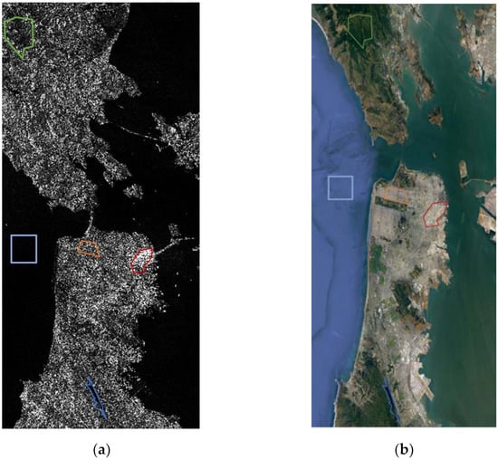 (a) The intensity of the HV channel in the fully polarimetric dataset, which has undergone calibration and geocoding processes, illustrates the San Francisco Bay area. (b) The ground truth data as depicted through Google Earth. The highlighted regions in both images correspond to the dataset used for evaluating the proposed method.
