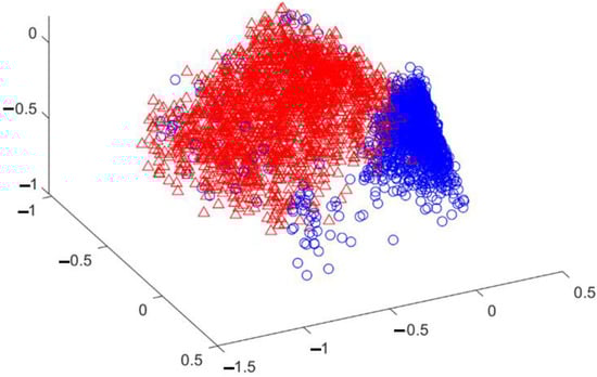 Sea (Red)–City (Blue) cluster in the 3D space determined by the eigenvectors corresponding to the largest eigenvalues.