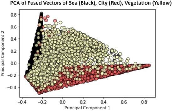 Presentation showcasing the two principal components containing the most significant information from the feature vectors corresponding to the Sea region (depicted in black), City (depicted in red) and Vegetation (depicted in yellow).