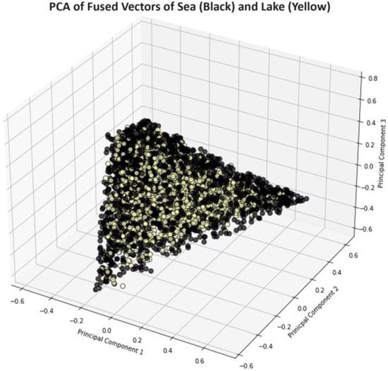 As has already been studied, differentiating between the lake and the sea proves to be the most challenging aspect. Therefore, in this specific case, the three components of PCA are employed to illustrate how these features are positioned within the feature space.