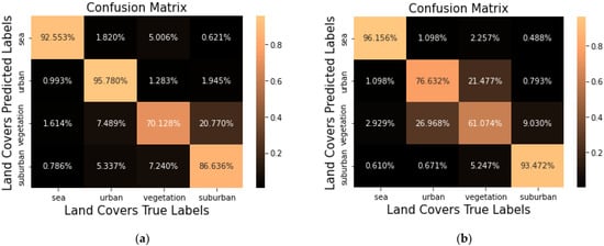 A detailed examination of the confusion matrices provides deeper insights into our findings. Notably, within the sea category, characterized by homogeneity, our classification success rates surpassed 92% in both scenarios. However, challenges emerged in distinguishing vegetation land cover, with the lowest percentages recorded. Specifically, using the first feature fusion method, only 61% of samples were successfully classified as vegetation, with the remainder erroneously categorized as part of the urban fabric. This misclassification can be attributed to less rigorous region selection, allowing the inclusion of vegetation patches in urban fabric and vice versa. Additionally, preprocessing procedures played a pivotal role, as both urban and vegetation targets appeared dispersed across multiple PolSAR cells, contributing to lower accuracy percentages.