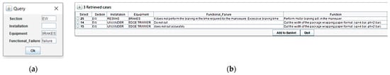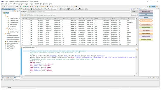 Upon the establishment of a structured attribute database, derived from the case base (see Appendix A), the initiation of the computer application unfolds, using the Java programing language within the Eclipse environment. However, the execution of the corresponding logical functioning flow of the CBR method transpires through queries. This procedural cycle encompasses two distinct stages. The initial stage is dedicated to the application of the CBR flow to the FMECA segment of the RCM method. This entails the recovery of failure modes within the case base, subsequently subjecting them to a comparative analysis with the novel problem being posed through consultation. The ensuing stage endeavors to reapply maintenance actions, entailing a comprehensive reassessment of parameters such as the risk priority number (RPN), maintenance task instruction, maintenance class, interval, and the assigned responsible workshop.