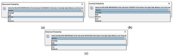 Dialog boxes for the evaluation, in linguistic terms, of the relative importance of each risk factor: (a) occurrence probability; (b) severity probability; and (c) detection probability.
