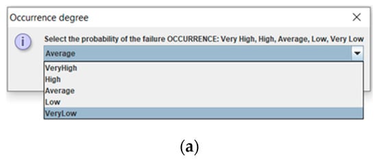 In Figure 4, data on the values of the three risk factors of occurrence, severity, and detection are entered by choosing from a drop-down list the most appropriate term that defines each of them for the functional failure analyzed. In this way, the expert goes from trying to evaluate precisely and numerically to using a more natural language with human tolerance. As a result of the calculation, an information box appears with the new RPN value, calculated with the new implemented methodology, as shown in the last figure in Figure 4.