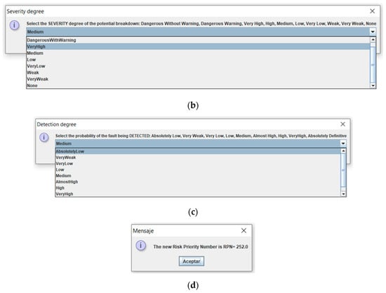 Dialog boxes for the evaluation, in linguistic terms, of the relative importance of each risk factor: (a) occurrence degree; (b) severity degree; (c) detection degree; and (d) New RPN.