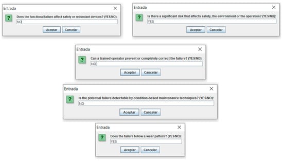 The second revision stage comprises redefining the new maintenance policy or class following the RCM diagram, where the user has been guided through the questions in the diagram, as shown in Figure 6. The maintenance policy is obtained as an output. In this work, the maintenance classification obtained is Maintenance by Operator, thus completing the solution of the chosen case (see the last case in Figure 7a), which is split for better display.