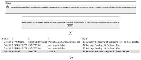 In this new added case, Figure 7b, the values of the attributes identified in the S/I/E/FF columns have been automatically recovered as the input data from the problem posed, Query window Figure 2a, where F, FE, and FM are not shown for simplicity and are automatically recovered by the system and incorporated into the added case. In this new added case, the remaining values of the II/R/PT/fRPN/MC attributes have been recorded as a solution, which is finally adopted by the assisted system, because of the two-stage process described above. The values of this resolved case are included in the case identified as IDC = E in Table 7.