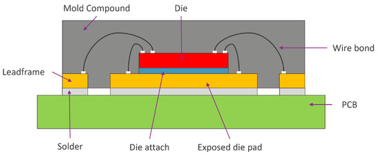 A QFN (Quad Flat No-leads) is a low cost, compact, lightweight package with improved thermal performance, and it is widely used for programmable modules and microcontrollers. QFNs are characterized by abundant geometrical discontinuities (such as edges, corners) and multilayer construction with several materials which makes them prone to delamination. QFNs are widely used in automotive applications where the delamination of QFN packages is a known issue which affects the package reliability. For these reasons, the QFN is used as a case study in this work. The QFN package consists of a silicon die connected to a copper pad using die attachment material, and the full system is encapsulated using an epoxy molding compound (EMC). The cross-sectional view of the QFN package is presented in Figure 1.