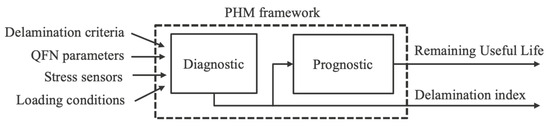 The framework, presented in Figure 2, consists of diagnostic and prognostic modules. The former provides the current health index of the QFN, whereas the latter forecasts the evolution of the health index over time, i.e., the remaining useful life of the QFN. The health index of the QFN is described by a metric which we call the delamination index. This metric is used to characterize the monotonic evolution of die delamination from 0, no die delamination, to 1, end of the useful life of the die. As input, the framework relies on loading conditions, stress sensor values, delamination criteria, and QFN parameters. As output, the framework provides the delamination index and the remaining useful life of the QFN. The rest of this section presents in more detail the diagnostic and prognostic modules leveraging on the use case as a running example.