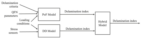 The diagnostic module provides as output the delamination index of the QFN. The delamination is determined by a hybrid model which combines the delamination indexes predicted by the PoF and DD models. Aizpurua et al. [21] have developed a decision framework which guides the designer in deciding the layout of the hybrid model without implementation details. From this framework, we selected a parallel layout to improve the estimation accuracy of the single models, and then, we further elaborated on the hybrid model by describing how the output of the PoF and DD models are combined in practice for diagnostic purposes. The hybrid model also presents limitations and assumptions which depend on the data-driven and PoF model used. Indeed, a qualitative dataset is required in order to train correctly the data-driven model. Furthermore, the specific nature of the PoF model limits the hybrid model’s usability across different integrated circuits or conditions. Figure 3 illustrates the three components of the diagnostic module.