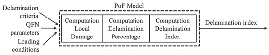 - Computation of the local damage. A 2.5D model is a finite element model used to mimic the QFN behavior. Based on the input parameters, this model provides the evolution of the local damage index for each one of its nodes. The model discretizes the structure of the material into smaller shapes called elements (lines, plates, bricks, tetrahedral), and these elements are bounded by nodes (e.g., line element is bounded by one node at each end) [22]. The local damage index is calculated by monitoring normal and tangential stresses at each node to evaluate delamination criteria. The local damage index is set to 1 as soon as the delamination criteria is fulfilled.