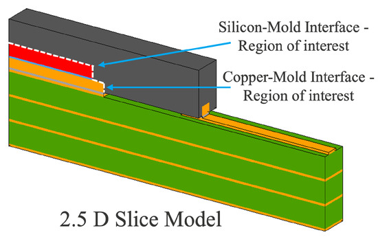 The QFN is modeled as a 2.5D model, a slice of a full QFN package model, using a commercial finite element software. The package is modeled with silicon–mold and copper–mold interfaces. A structural symmetry boundary condition is also applied on the model to define the 2.5D slice model as shown in Figure 5. Under thermal loading conditions, the QFN package is subject to EMC-Die and EMC-Leadframe delamination. This model uses the delamination criteria shown in Equation (5).