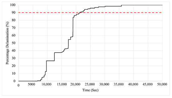 Figure 6. An example of the evolution of delamination percentage. The horizontal dashed line represents a possible threshold to define the end of life of the package. - Computation of the delamination index. The delamination percentage is converted to the delamination index for the QFN package. The delamination index ranges from 0, no die delamination, to 1, end of remaining useful life of the die. This end of life is application-dependent, and it is reached when the delamination percentage goes above a certain threshold. This threshold depends on the type of electronic system where the delamination takes place. On the one hand, in applications with small power dissipation, just 10% delamination in the die attachment contact area can still assure good functionality in an application-specific integrated circuits. On the other hand, in an application with larger power dissipation, 20% delamination of the contact area can cause the end of life of the component [16]. To take into account this threshold, the delamination index, which we call , is mapped to the delamination percentage as described in Equation (1) as follows:where represents the delamination percentage at time t; the threshold represents the level of delamination percentage after which the end of life is reached. The latter, being domain-dependent, can be defined based on the end user specifications.