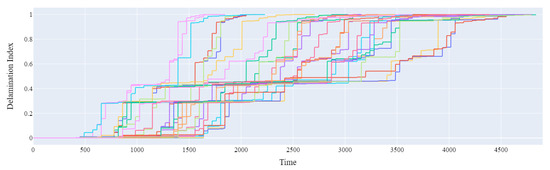 A library of DI curves is created. In this library, described as , each curve has a different time length and presents a monotonic-like evolution from 0 (no die delamination) to 1 (end of life), i.e., , as shown in Figure 10.