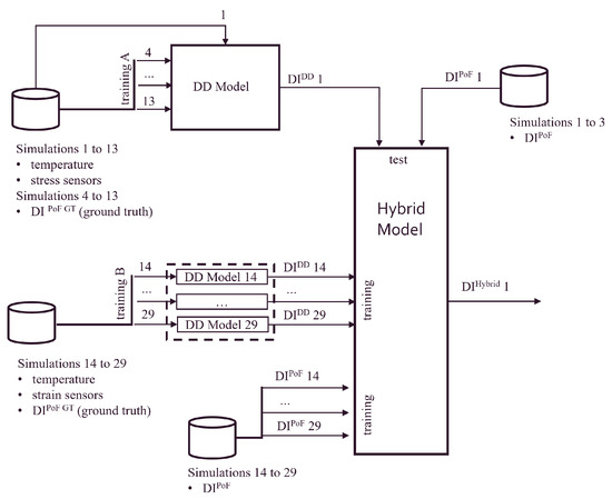 Figure 16. Example of training and testing of the hybrid model. The hybrid model is trained using DI curves generated from simulations in training B, whereas it is tested using DI curves generated from simulations in training A. The output 1 represents the DI curve computed by the hybrid model when it receives as input the testing DI curves. The latter two testing curves are generated by the DD and PoF models when the test simulation is 1. - The 13 simulations in training B are used to train 13 DD models using a leave-one-out approach. More specifically, 12 simulations are used to train a DD model, and the 13-th simulation is used to generate its associated DI. Figure 16 illustrates how simulation 14 can be transformed by the DD model 14 in the training delamination index which we call 14.