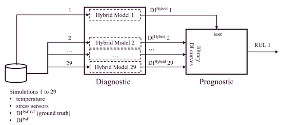 Figure 17. Example of training and testing of the prognostic module. Each hybrid model j is trained using all other DI curves except for the DI curves j-th and 1. The output RUL 1 is provided by the prognostic module when it receives as input the testing DI curve 1. The latter is generated by the diagnostic model when it receives as input the test simulation 1. - The RUL is computed for the curve test DI any time that the DI has a step increase of 0.1. The 0.1 threshold for computing the RUL is decided taking into account two aspects. On the one hand, if the threshold is too high, then the selectable step changes are too few, and this would hinder the possibility of highlighting the presence of a trend in the forecast performance. On the other hand, if the threshold is too low, then the selectable step changes may become too many. As a result, it would become more challenging to abstract a trend across the test curves. At the end of the validation, to evaluate the accuracy of the forecasted RUL, the relative error (RE) and absolute relative error (|RE|) are used. These metrics are chosen since they are commonly used for performance measures of the RUL. Equation (7) reports how RE is computed:where and represent the true and predicted EoL.
